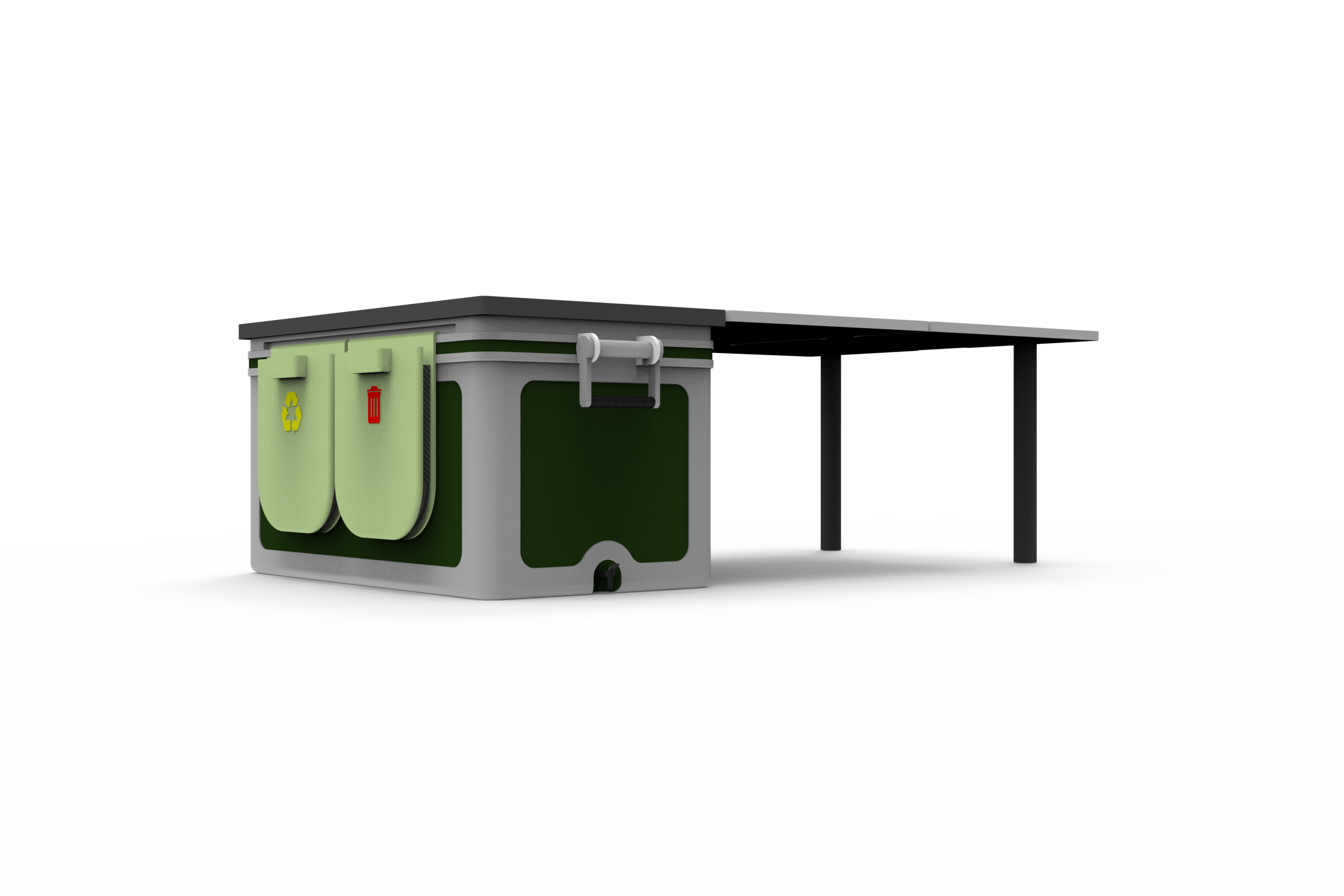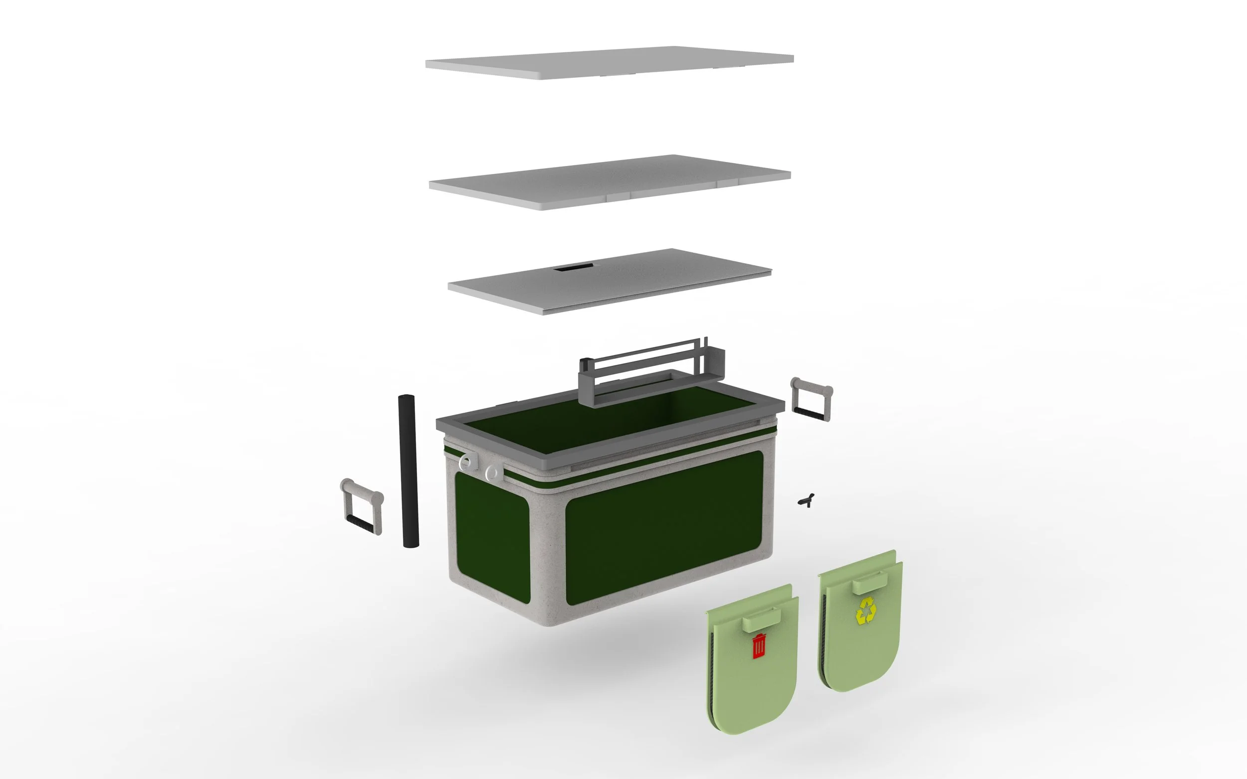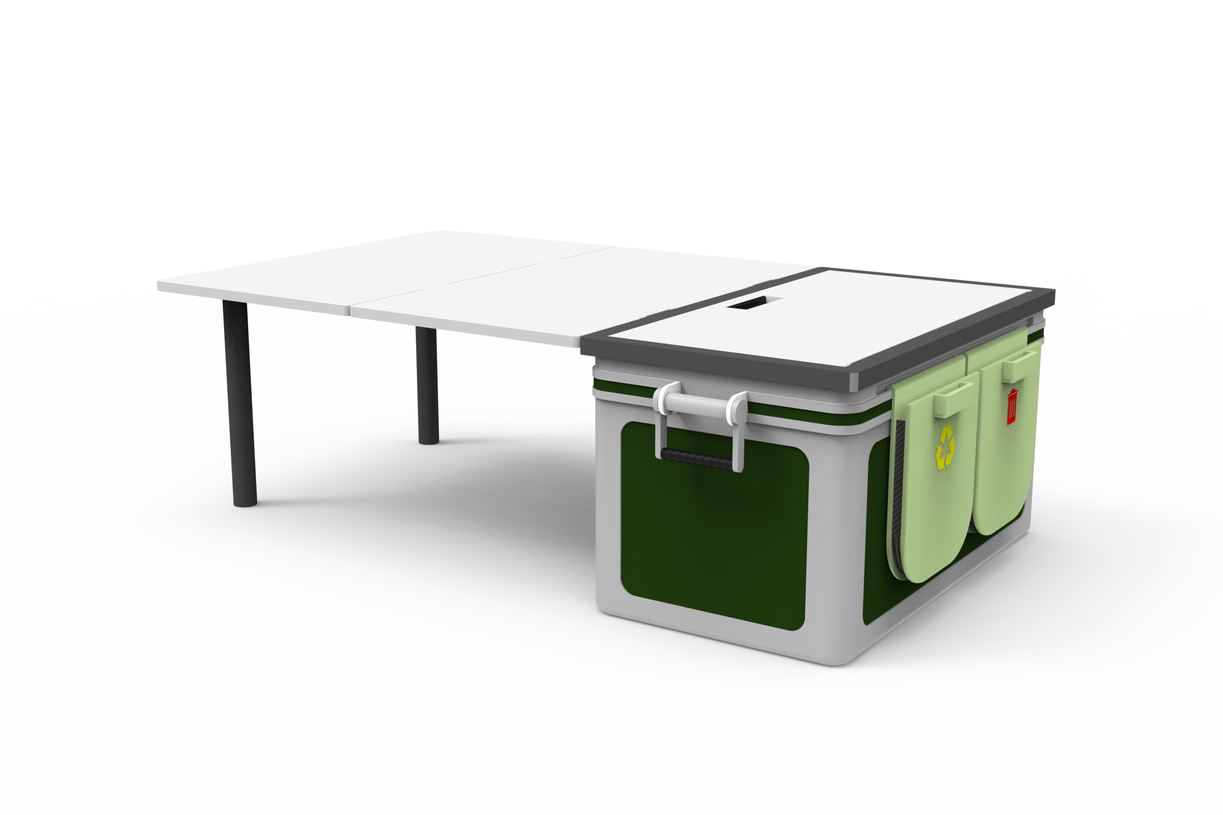 My product operates as both a table and an esky in a self-contained design with no need for extra parts or extra effort. I envision my product will be used in campsites, beaches, and in backyards. In all these environments, rubbish has to be disposed of after eating and preparing food, which creates issues with ecosystems and nature. My product has storage bins that with 18L of bin capacity in the individual bin. A bright design helps users to identify and remember that they should be disposing of rubbish correctly. The functional design of my products allows for ample storage space with an ample area for food preparation. The table allows users to keep their food off the ground and clean as well as providing a stable surface to put drinks on.