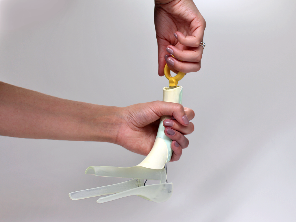 A functional model featuring the speculum in the open position. The handle comfortably fits the patient’s fingers and is pulled upwards to open. The pull handle of the device allows the handle to run along a rail and lock into the appropriate opening diameter (this is unique from person to person). This pull handle is attached to silicone elastic bands to open the blades of the speculum. The blades are attached to the main body via four hinges.