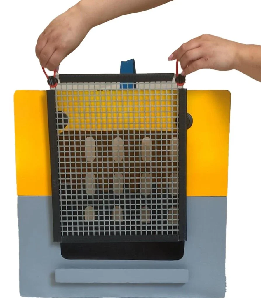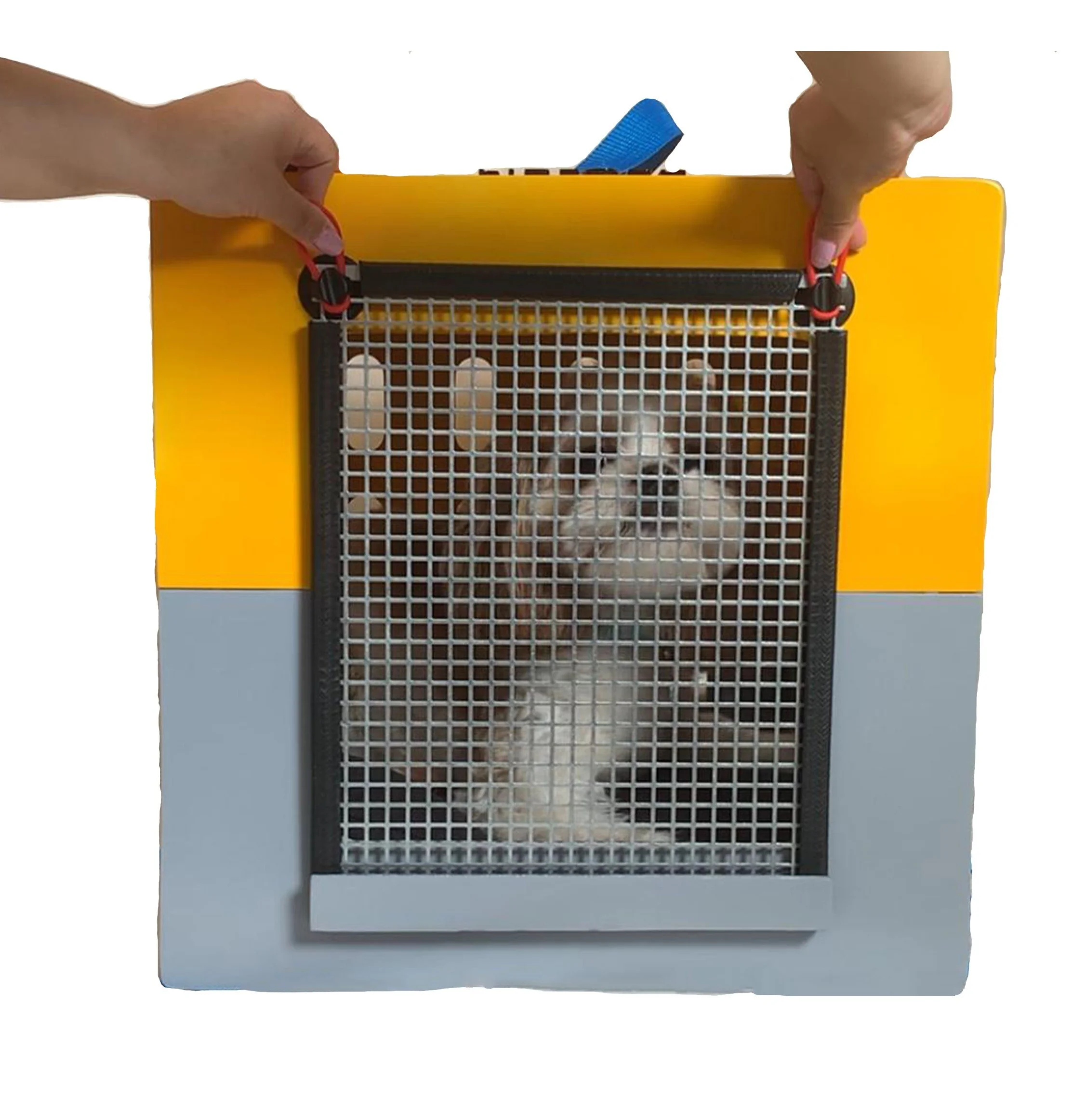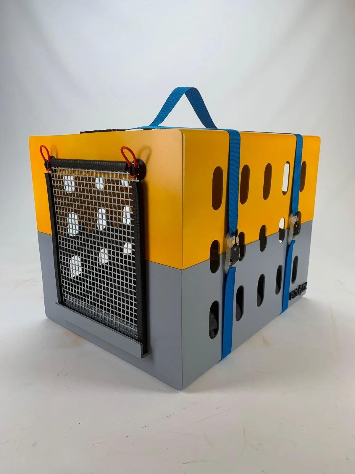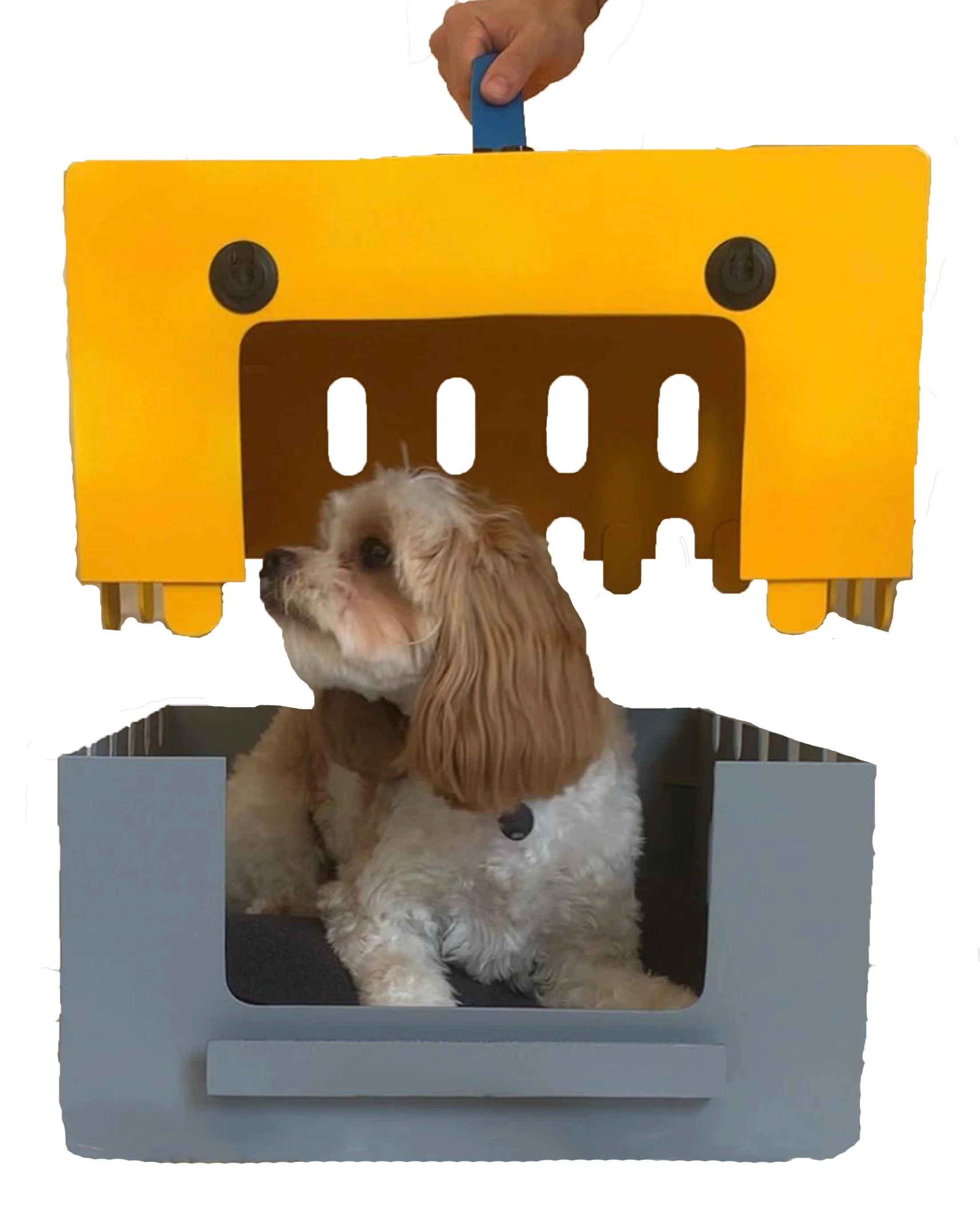 A travel pet carrier designed with ease of use, comfort and convenience to reduce pet anxiety and increase efficiency. With the integration of FidLock’s magnetic mechanic fasteners, the pet carrier can be disassembled. The pet carrier comprises of a top unit, bottom unit, an attachable handle, two securing straps, a pet cushion and a sliding wire door with rubber wire to prevent friction. The carrier can be transformed into a pet bed by removing the top unit. This allows the pet to become familiar with the environment and reduce the stress of being in an enclosed space. The magnets incorporated within the pet carrier are the SNAP ROPE, SNAP SEWABLE and the V-BUCKLE SLIM 20. To release the magnets, the user must slide the wire door up. For the straps, the tab is pulled and then lifted upwards. The handle’s magnets are released by pushing sideways. Each of the magnets are designed to counteract the movements of the pets that may push against the door. According to animal psychology, the colours yellow and blue are the most prominent and visible colours. The colour yellow is associated with happiness and energising. Blue is perceived to be calming and relaxes the eyes.