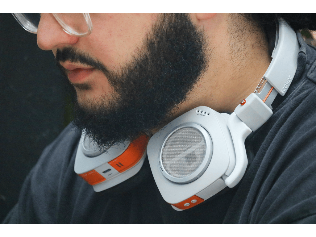 Ecomod headphones can be articulated to be around the neck of folded for portability.