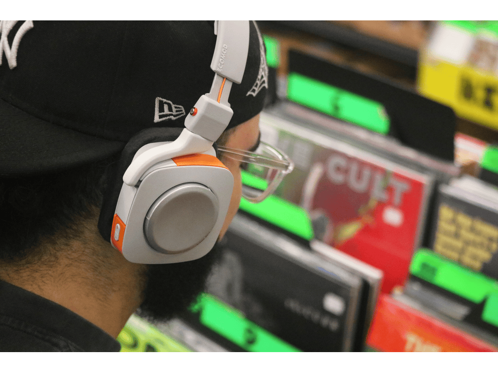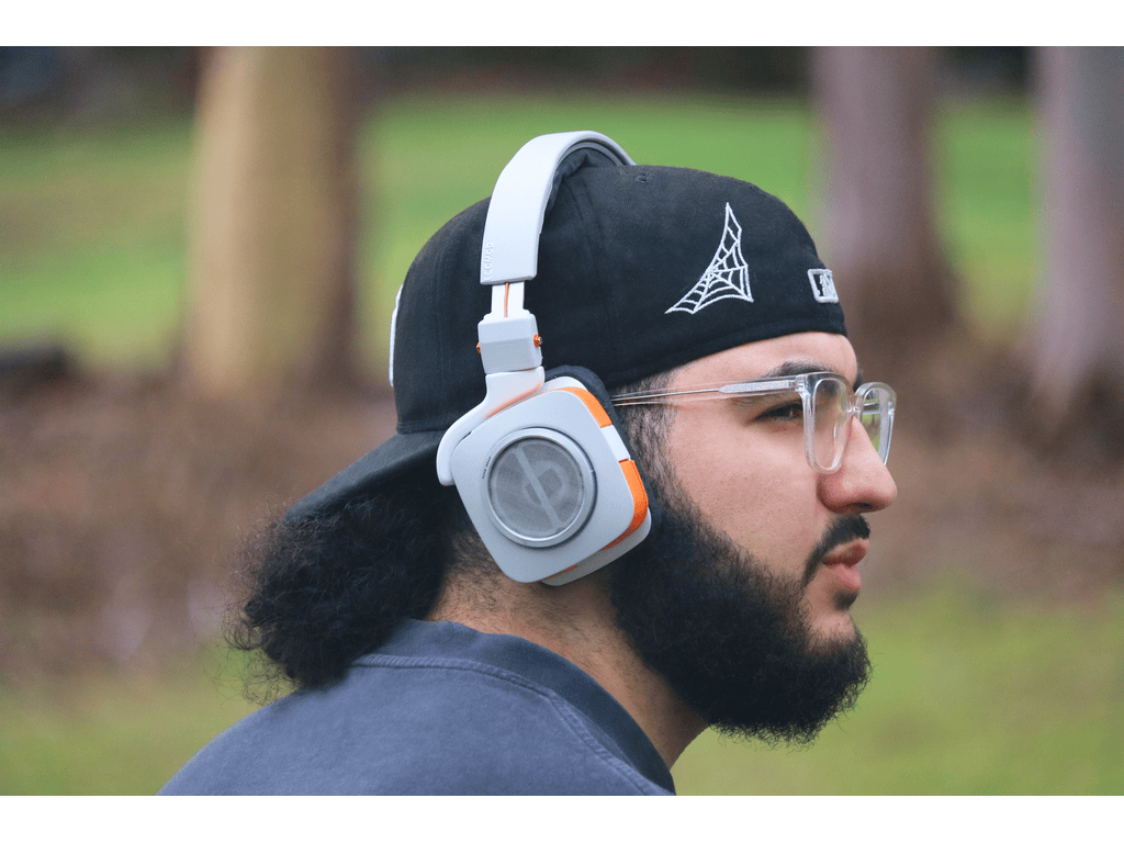 The Ecomod headphones on head with open-back and over-ear options attached.