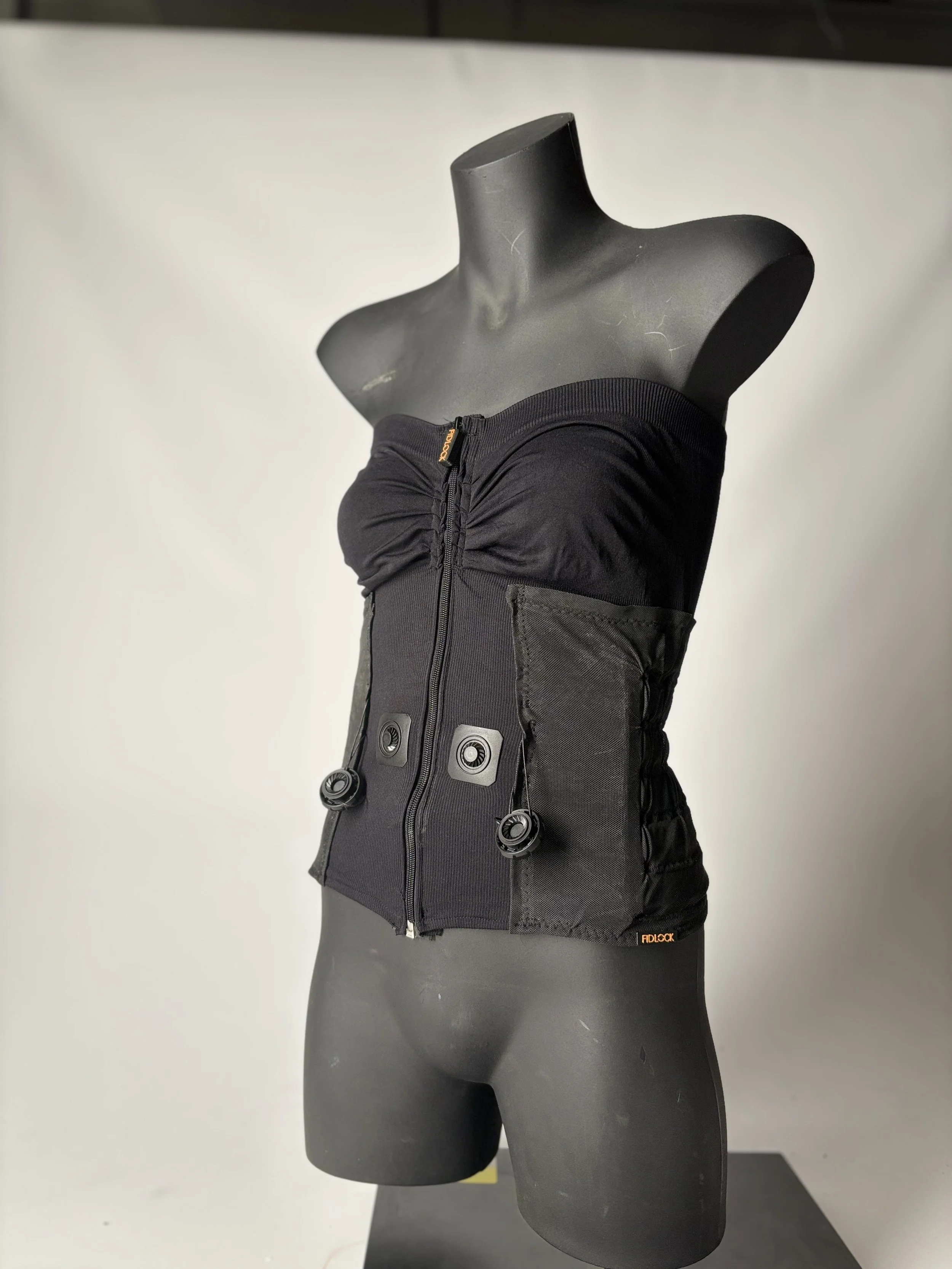 The garment features structured channels at the back that guide the compression bands, ensuring even pressure distribution. A winch system with haptic feedback enables users to achieve consistent and customisable compression levels, tailored to individual needs. This not only simplifies the donning process but also improves overall wearability, addressing the mobility challenges often faced by users post-surgery.