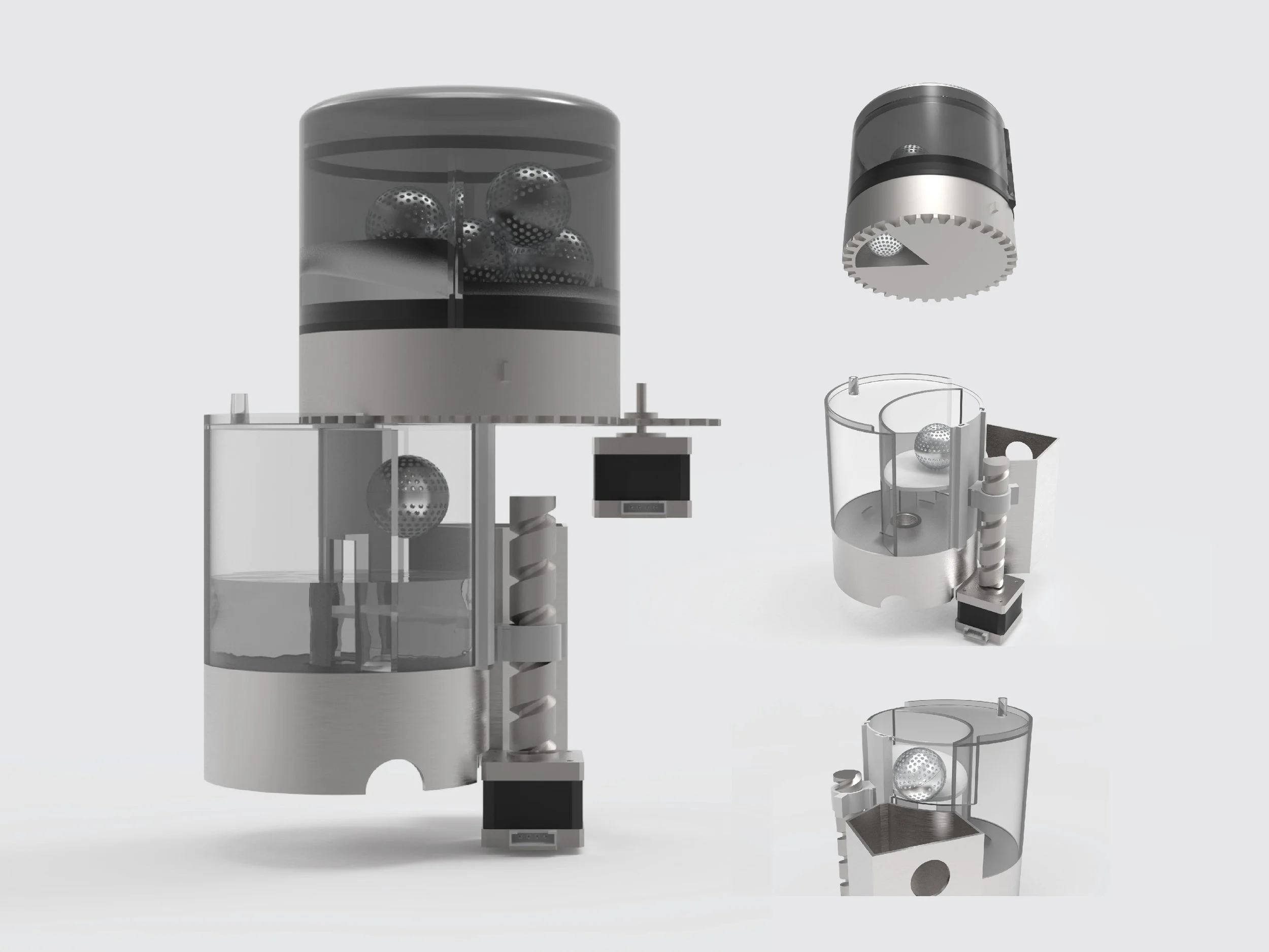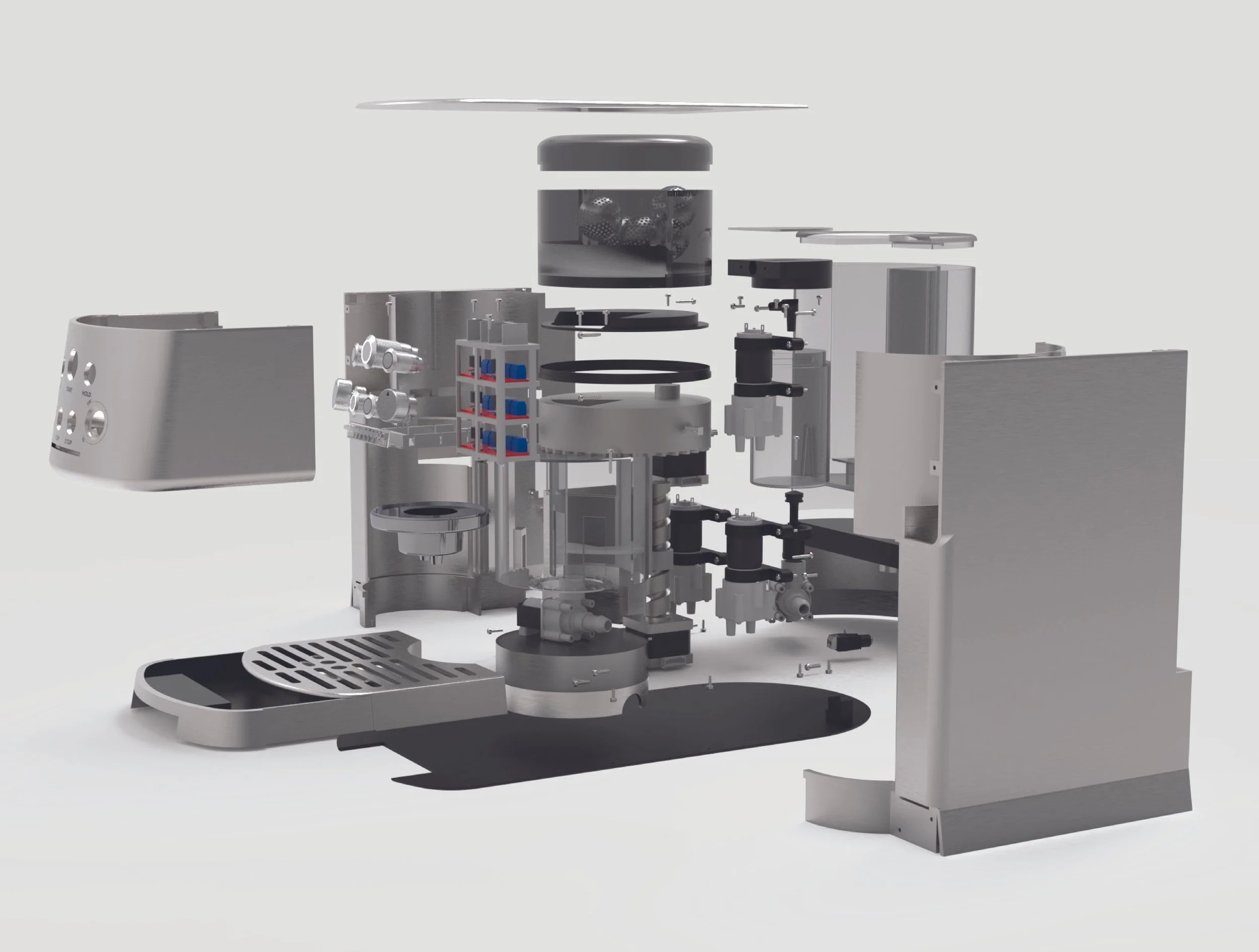 This exploded view showcases the intricate assembly of over 200 meticulously designed components that make up the tea machine. The fully functional model integrates advanced mechanical systems with electronic elements, all programmed to work seamlessly together.