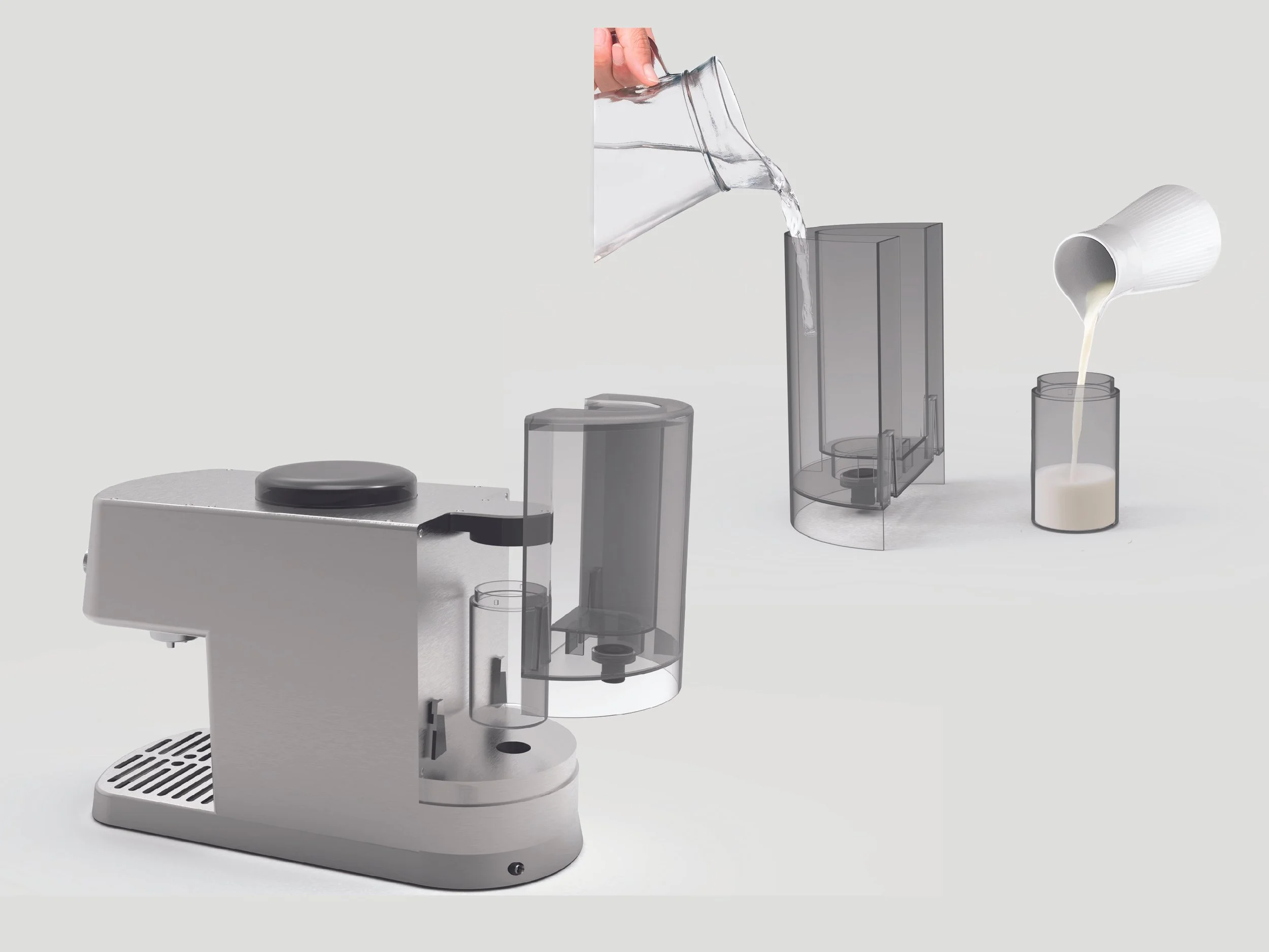 Water and milk are poured into dedicated reservoirs, where they are stored before use. The system automatically dispenses the precise amount of water for brewing, while the milk quantity can be adjusted by the user.