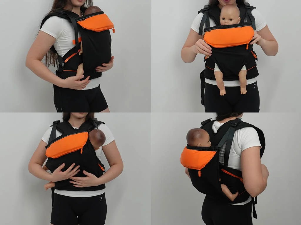 Carrier in front-inwards position (left), vest turned for hiking mode (right)