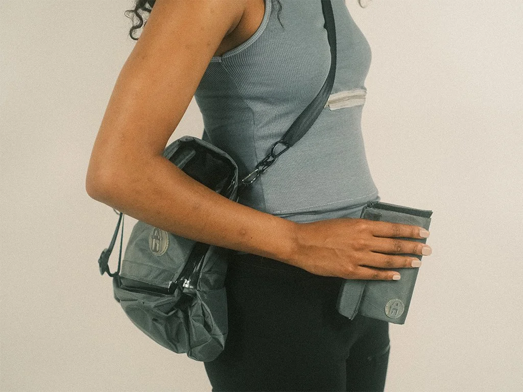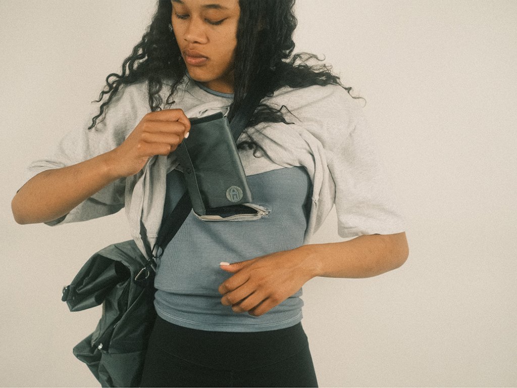 Model wears SAFE apparel and is taking out the medium pouch from the singlet.