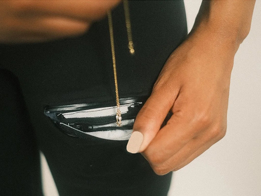 Model putting jewellery in the small SAFE pouch in the shorts pocket.