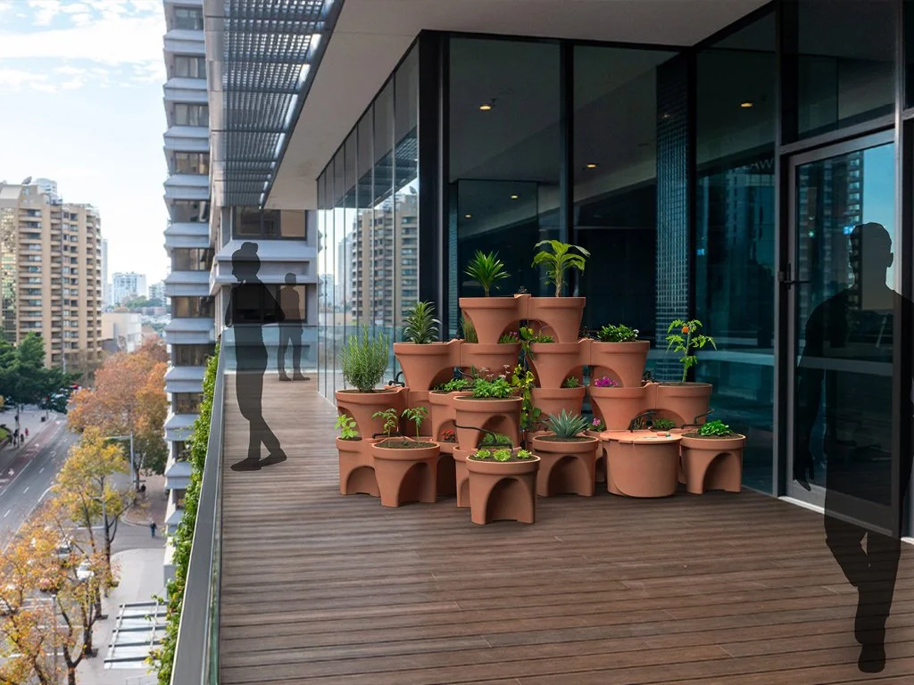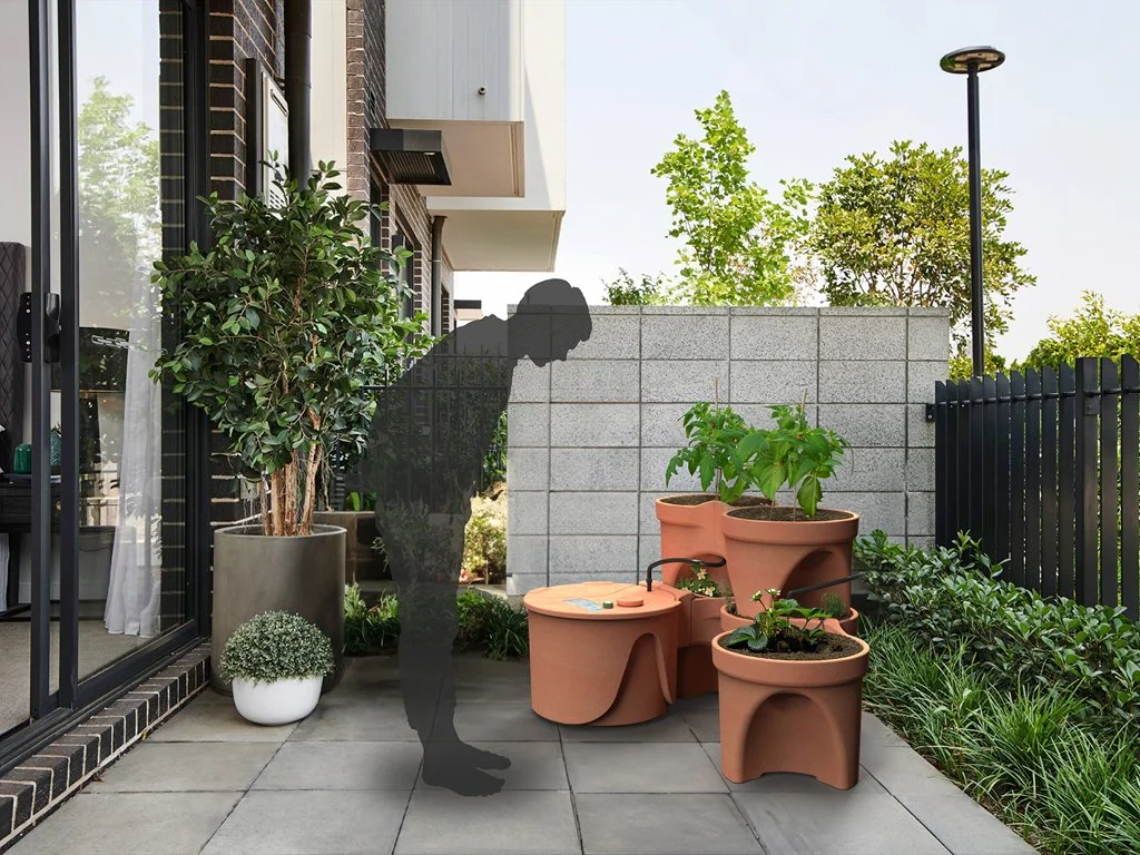 The garden system features a solar-powered reservoir module that irrigates modular planters, specifically designed to optimise edible plant production and maximise space efficiency in urban Australian homes