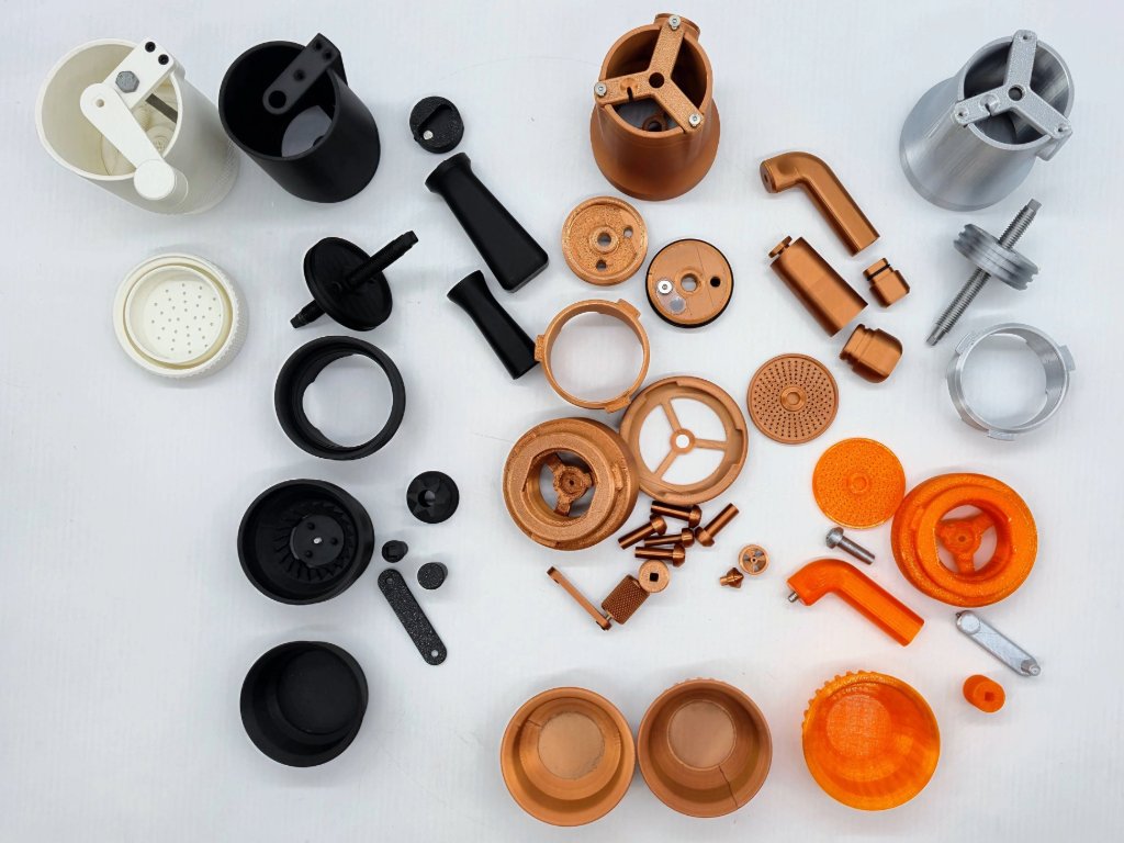 Most of the prototyping was done with FDM prints to fine-tune tolerances and details, with the final prototype SLM printed in stainless steel and SLA resin for the plastic components.