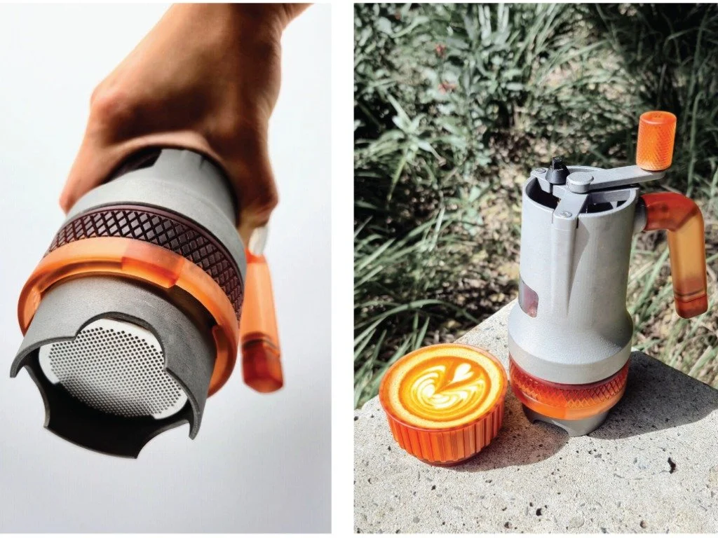 Designed for the outdoors — camping or short hiking trips — it is manually powered and designed to reach pressures of 9 bar (the ideal extraction pressure for espresso). It integrates an espresso machine, grinder, WDT tool, cup, and milk-texturing wand into one compact, durable product, with space to store two doses' worth of beans in the chamber to save further space.