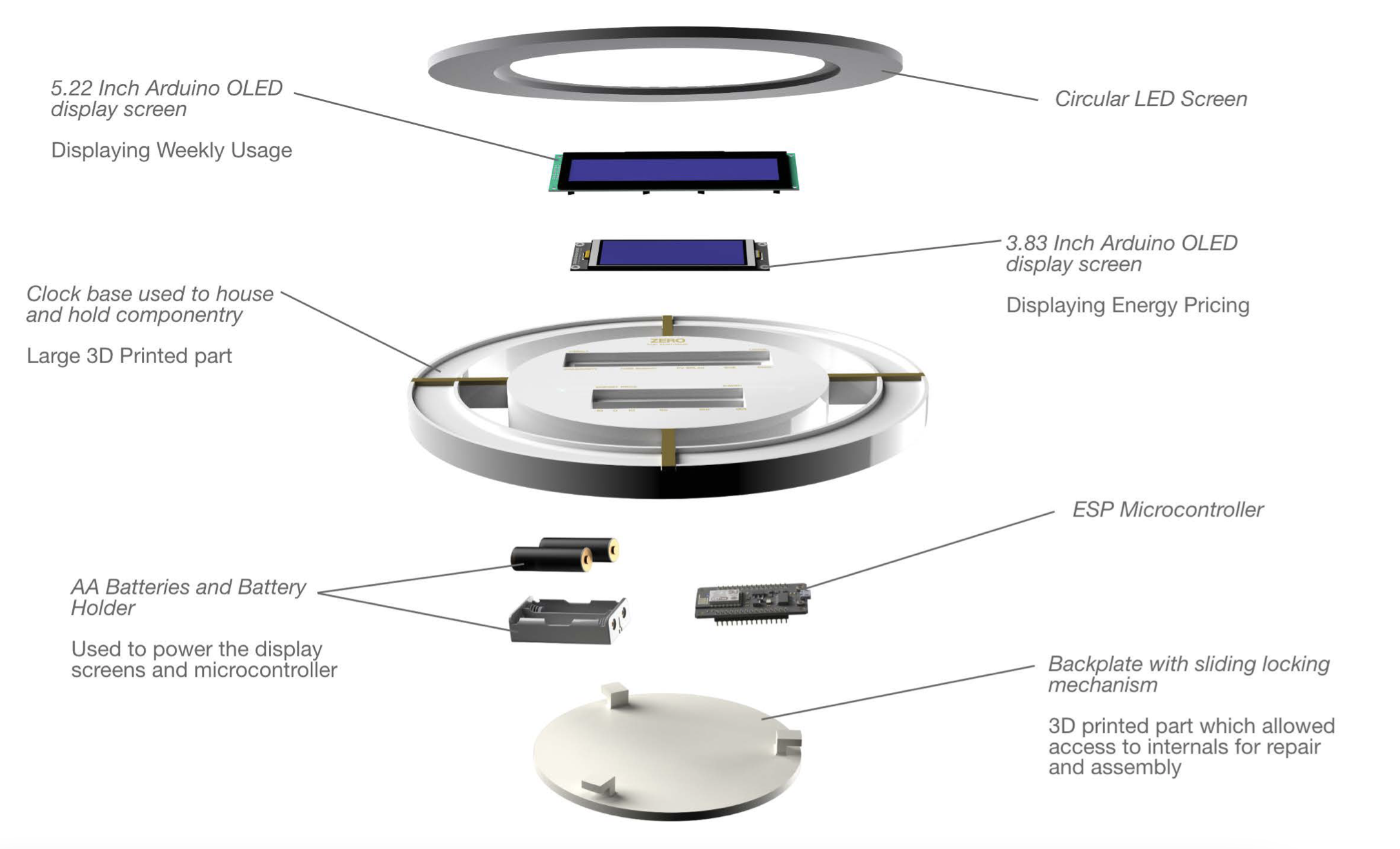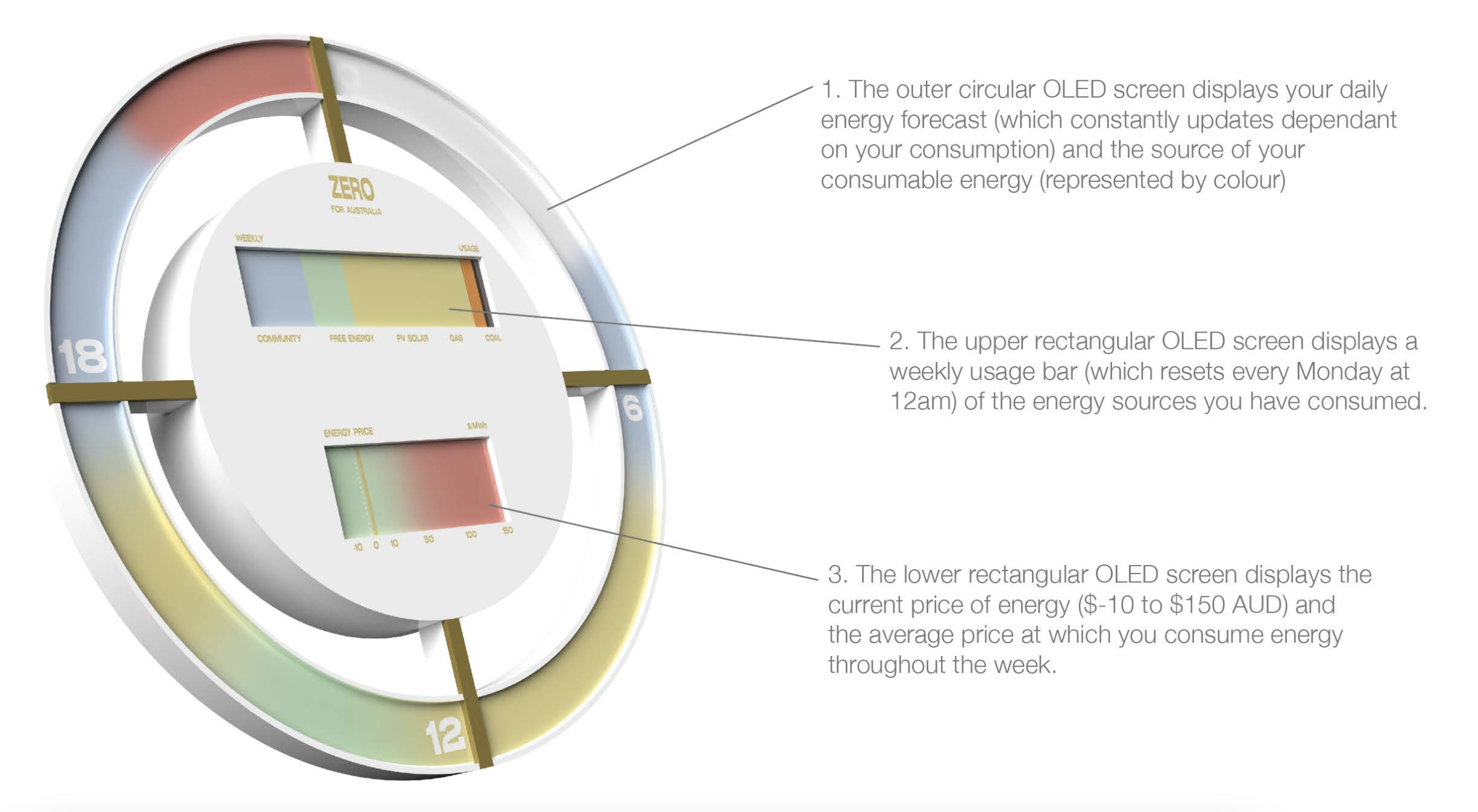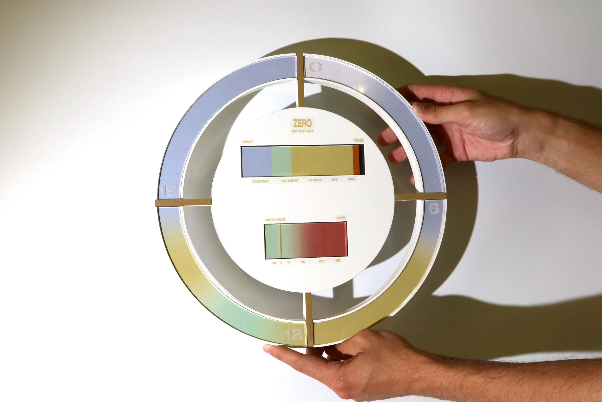 Zero is a 24-hour 'energy clock' which provides a daily energy forecast to assist you in managing your electricity more sustainably and economically. The purpose of the tool is to foster greater energy awareness and to empower climate activism within the household. Can we achieve global net zero through changing the behaviours and systems of the present? Zero is only possible with the presence of a reimagined transmission network and widespread renewable-only community battery systems, which is a possible future direction for Australia's energy network.