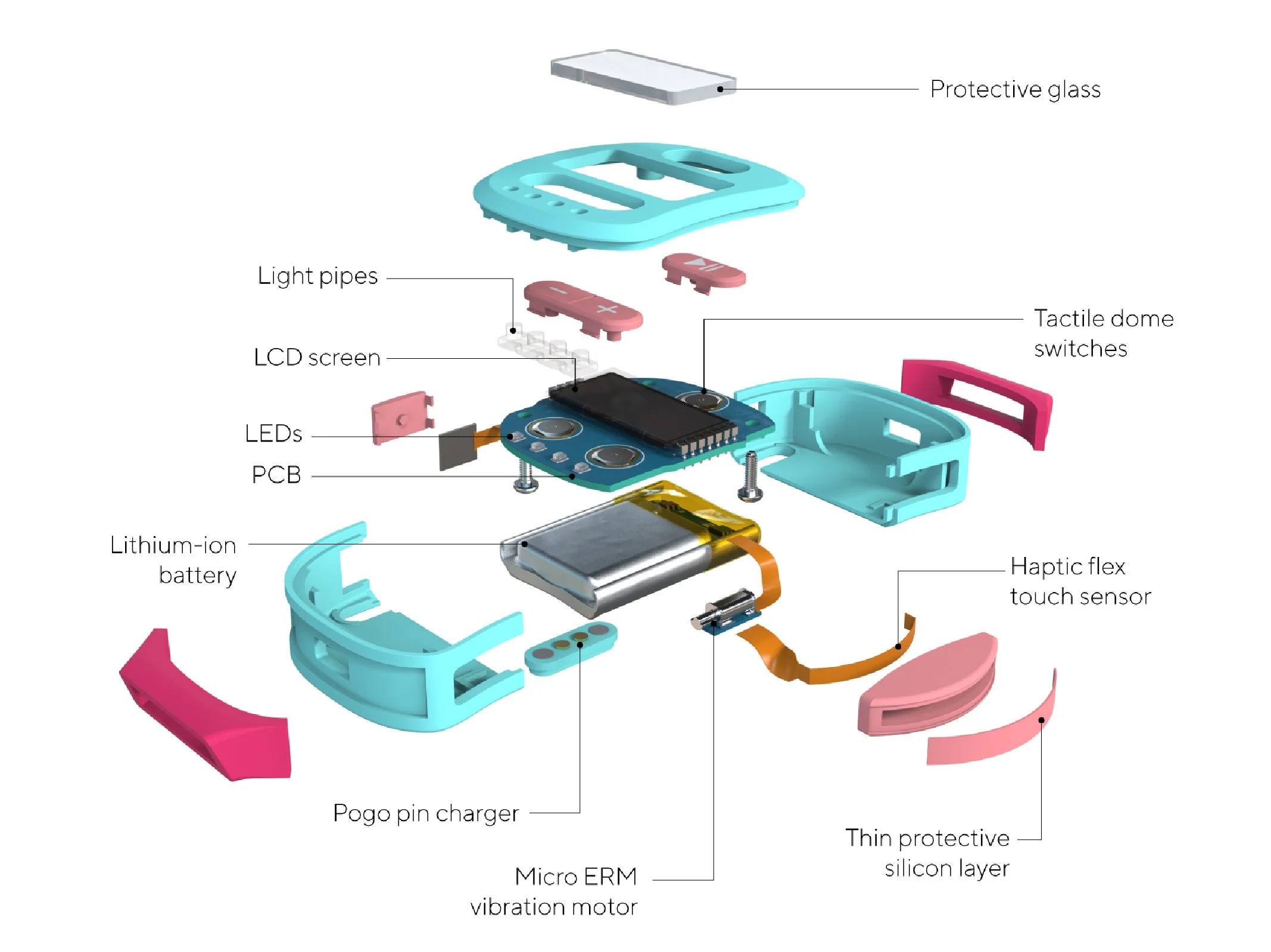 Each Rhythma wristband contains four vibrating motor discs that deliver haptic vibrations to the user.