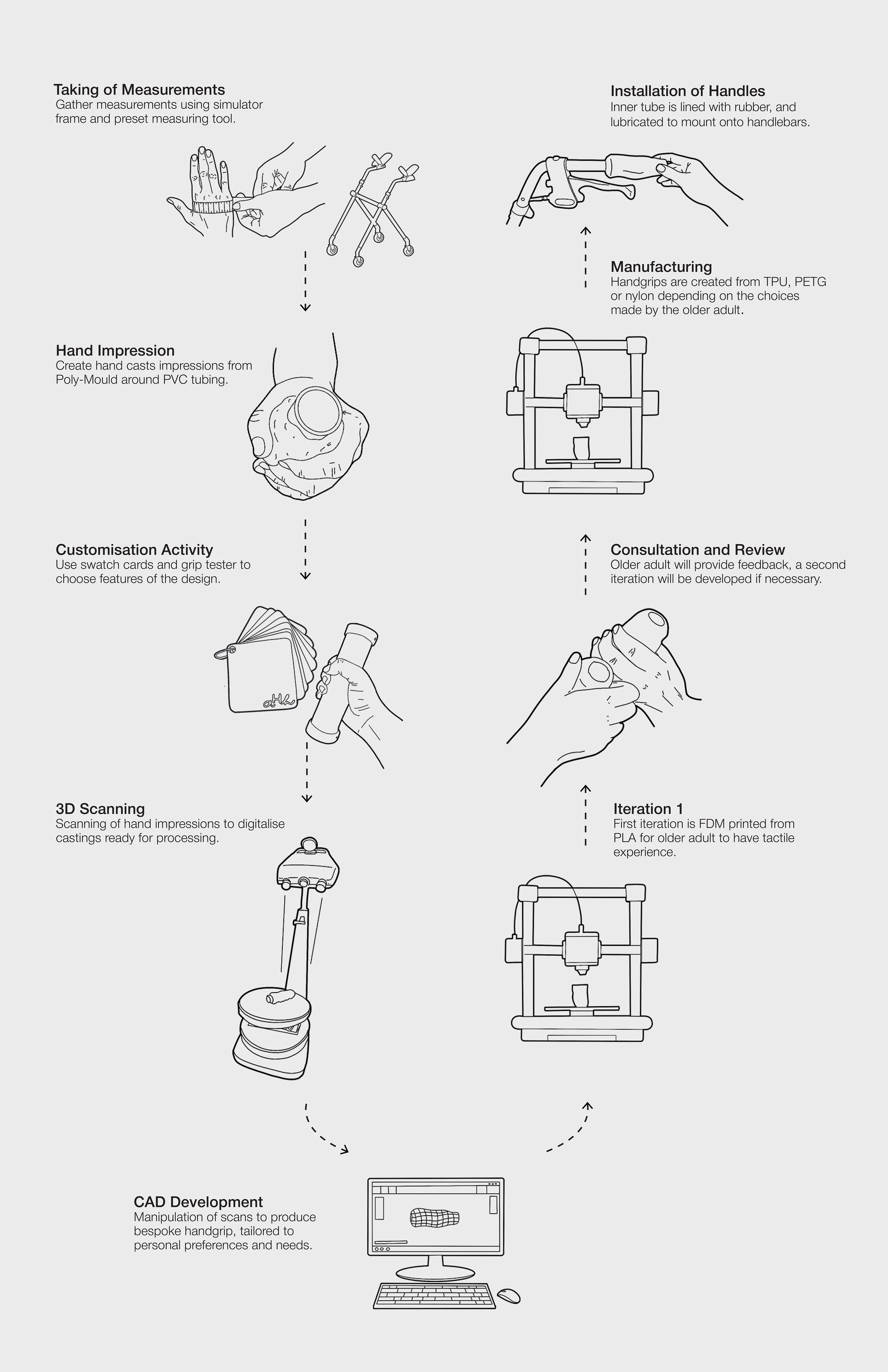 This research project aims to develop a co-design methodology for creating customised rollator handles for older individuals to be fitted onto their existing rollator frames. Rather than replacing the entire mobility aid, incremental change can foster a sense of familiarity while improving comfort, ergonomics, and user satisfaction. Additionally, the co-design process should encourage creativity and autonomy in decision-making for the older individual, and provide opportunities for them to gain new knowledge about advanced manufactruing technologies such as 3D scanners and 3D printers.
