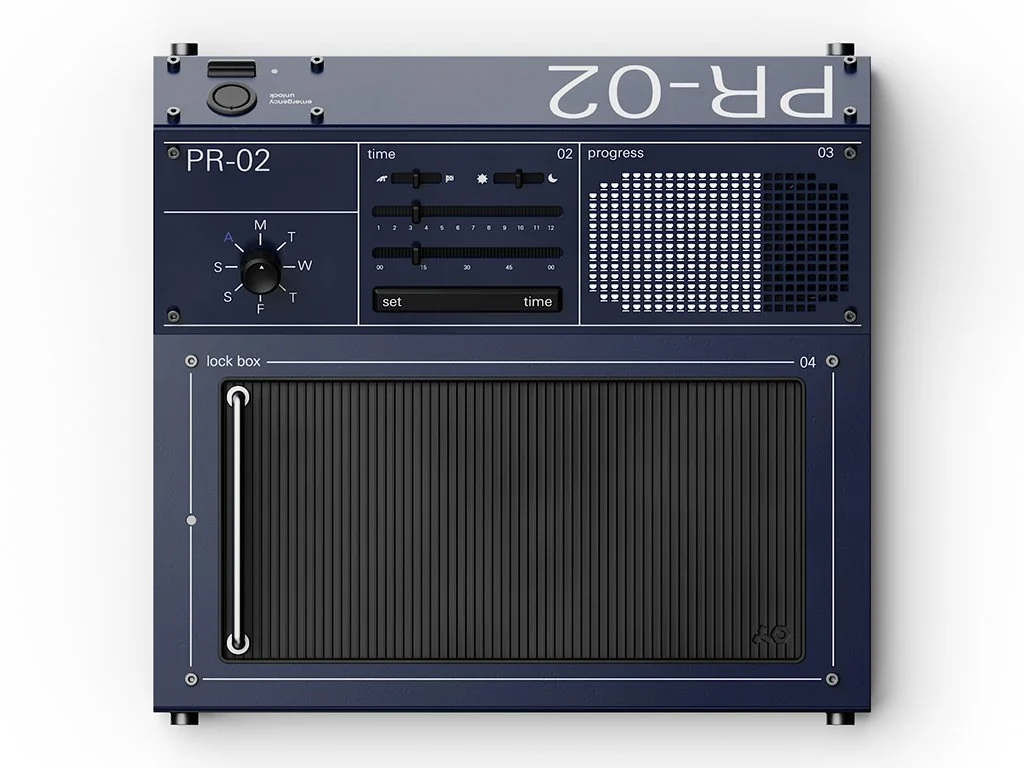 The PR-02 is a phone lock box that leverages strategies of building routines, sensory engagement, and user encouragement to assist in reducing smartphone addiction. At the beginning of the week, users input the date and time at which they would prefer the PR-02 to lock their smartphone. Once that time arrives, the device beeps and flashes its lights to indicate a lock-away period. To stop the lights, the user must place their phone in the front lock section, reducing phone usage through the creation of that particular habit. Engagement is enhanced by the progress-tracking LED matrix, which tracks successful weeks over a yearly period, alongside multi-sensory feedback through the integrated speaker beneath the slot section.
