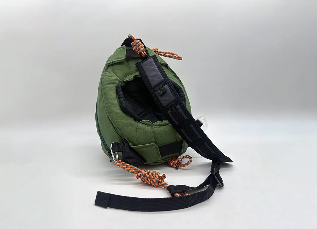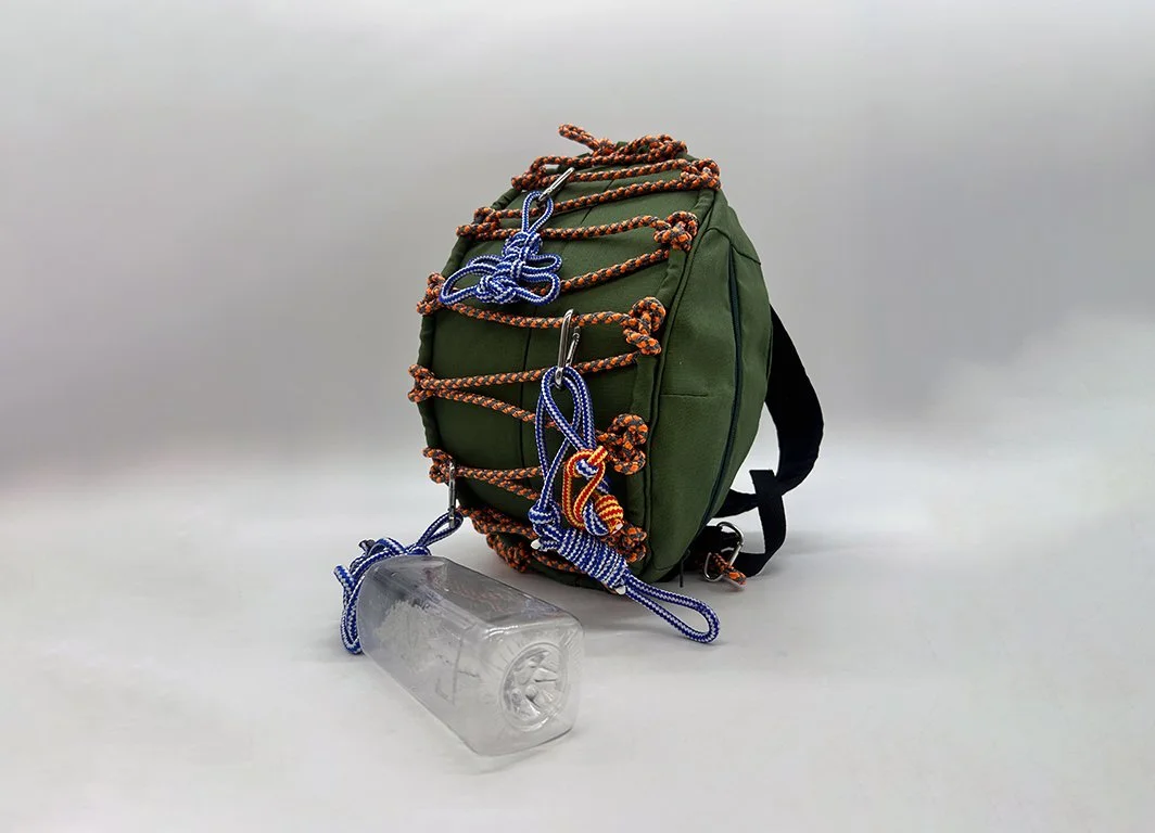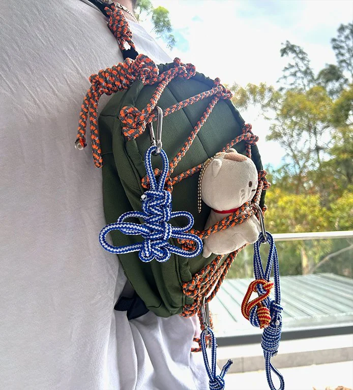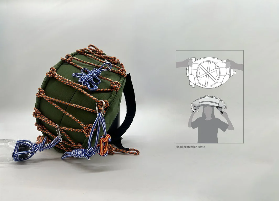 The MOLLE-inspired system has rows of rope tied onto its backside, forming attachment points for accessories and personal belongings which can be easily tied to them using any type of cord. Rope-tying as an open-ended play activity is encouraged as a learnt skill for attaching belongings to these straps and making unique rope-tying trinkets. Soft foam cushioning for the back is sewn in three columns to provide comfort when worn and to prevent internal stored items from protruding. In its centre is a shallow concave indent, intended for head placement so Knot-Pod's main body can protect the user above their head — specifically responding to falling debris during earthquake scenarios. Handles on the back of the main body are to be used for better balance when the bag is on top of the head. They are placed there to avoid the hands being positioned on top of the main body where falling debris would make contact and cause physical harm.