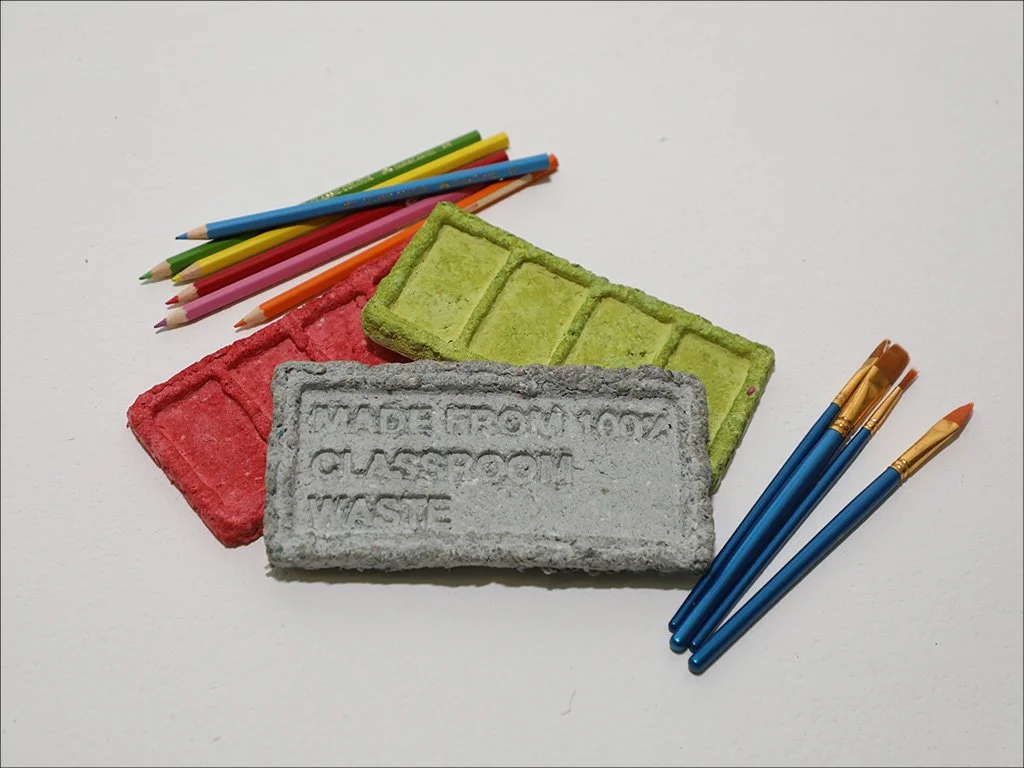 Paper pulp pencil trays, and paint palettes